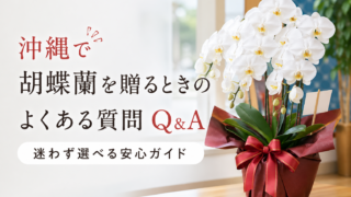 FAQのページ 沖縄で胡蝶蘭を贈るときのよくある質問Q&A|迷わず選べる安心ガイド 沖縄で胡蝶蘭をお祝いに贈る際のよくある質問をまとめました。配達エリア・立札の書き方・法人向け請求書払い・当日配達の可否など、創業17年の花屋アレンジマニアが丁寧に解説します。沖縄の胡蝶蘭よくある質問 2026.04.27 FAQのページ