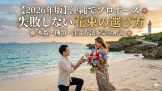 プロポーズ 沖縄プロポーズ花束おすすめ完全ガイド|赤バラ108本・ホテルサプライズ成功のコツ 沖縄でプロポーズ花束を用意する方法を徹底解説。赤バラ108本や白バラ、ひまわりの花束など人気の花束やホテルサプライズのポイントを紹介。創業17年の花屋アレンジマニアが沖縄で成功するプロポーズをサポートします。写真確認・ホテル配達にも対応。 2026.03.05 プロポーズ