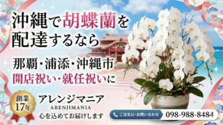 開店祝い 沖縄で胡蝶蘭を配達するなら|那覇・浦添・沖縄市の開店祝い・就任祝いに創業17年のアレンジマニア 創業17年・沖縄の花屋アレンジマニアが、那覇市・浦添市・沖縄市へ胡蝶蘭を配達します。開店祝い・就任祝い・設立祝いに大人気の沖縄県産大輪胡蝶蘭。立札・ラッピング・写真付き納品がすべて無料。法人様にも対応。 2026.04.08 胡蝶蘭商品一覧開店祝い